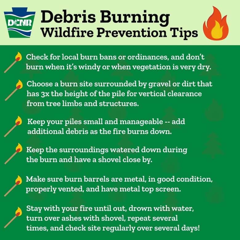 Residents should exercise caution during these months, especially when engaging in activities like the burning of leaves and other debris, which is a major cause of forest fires in Pennsylvania. Here are a few fire prevention tips from the PA Department of Natural Resources: