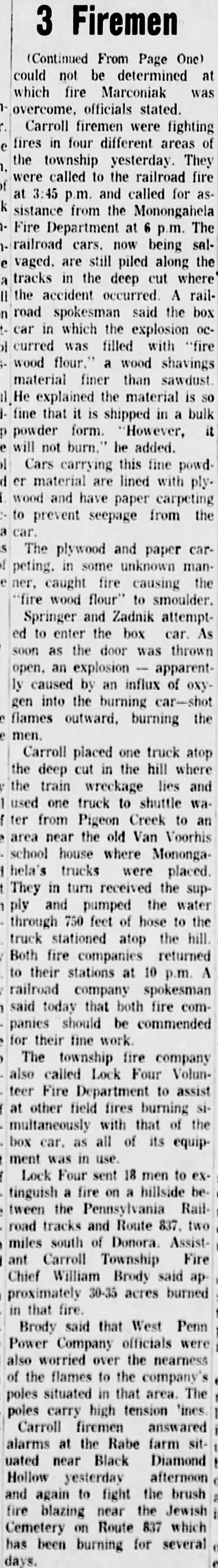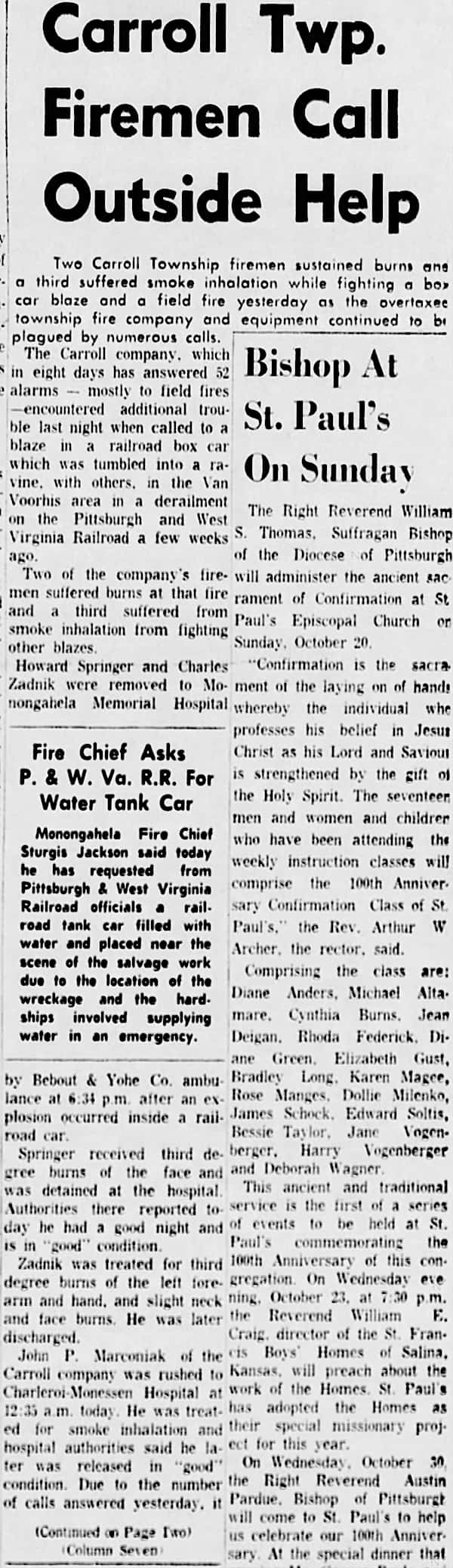 In the autumn of 1963, our watershed experienced an exceptionally severe drought that had been plaguing the region for weeks. This led to increasingly dry conditions and heightened fire risks. The firefighters of the Carroll Township Volunteer Fire Department were fatigued. They responded to 52 fires within only eight days. On Wednesday, October 16, yet another fire broke out. This time, it occurred in a derailed boxcar along what is now known as Norfolk Southern’s Ellsworth Branch, which runs adjacent to Pigeon Creek.