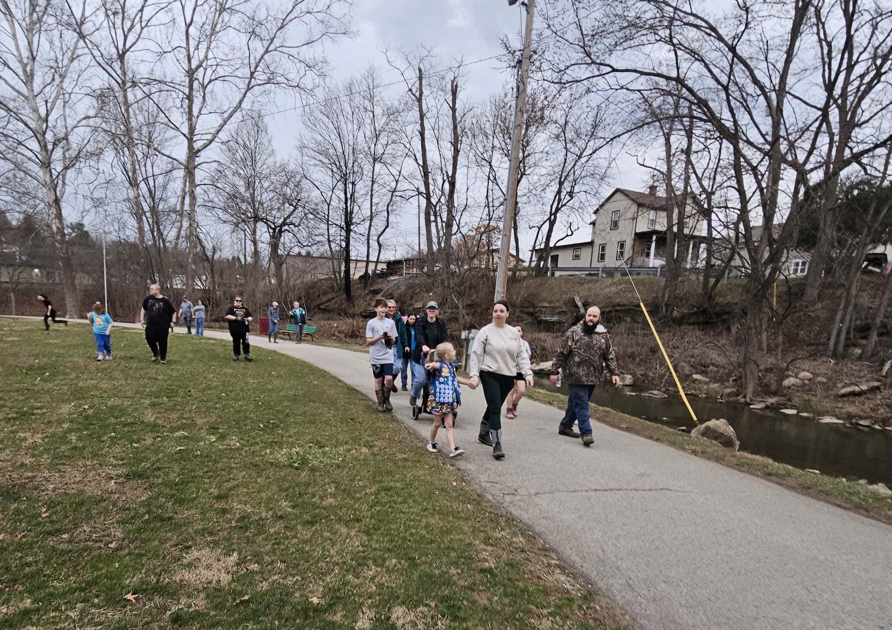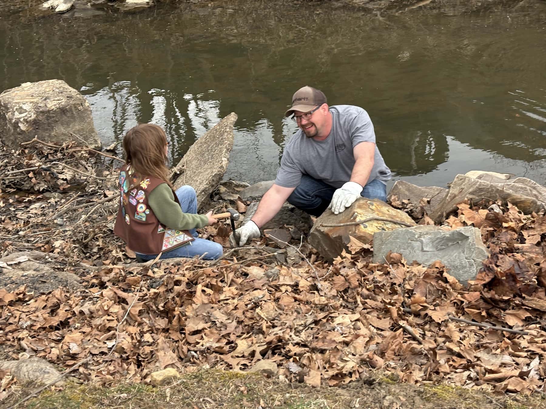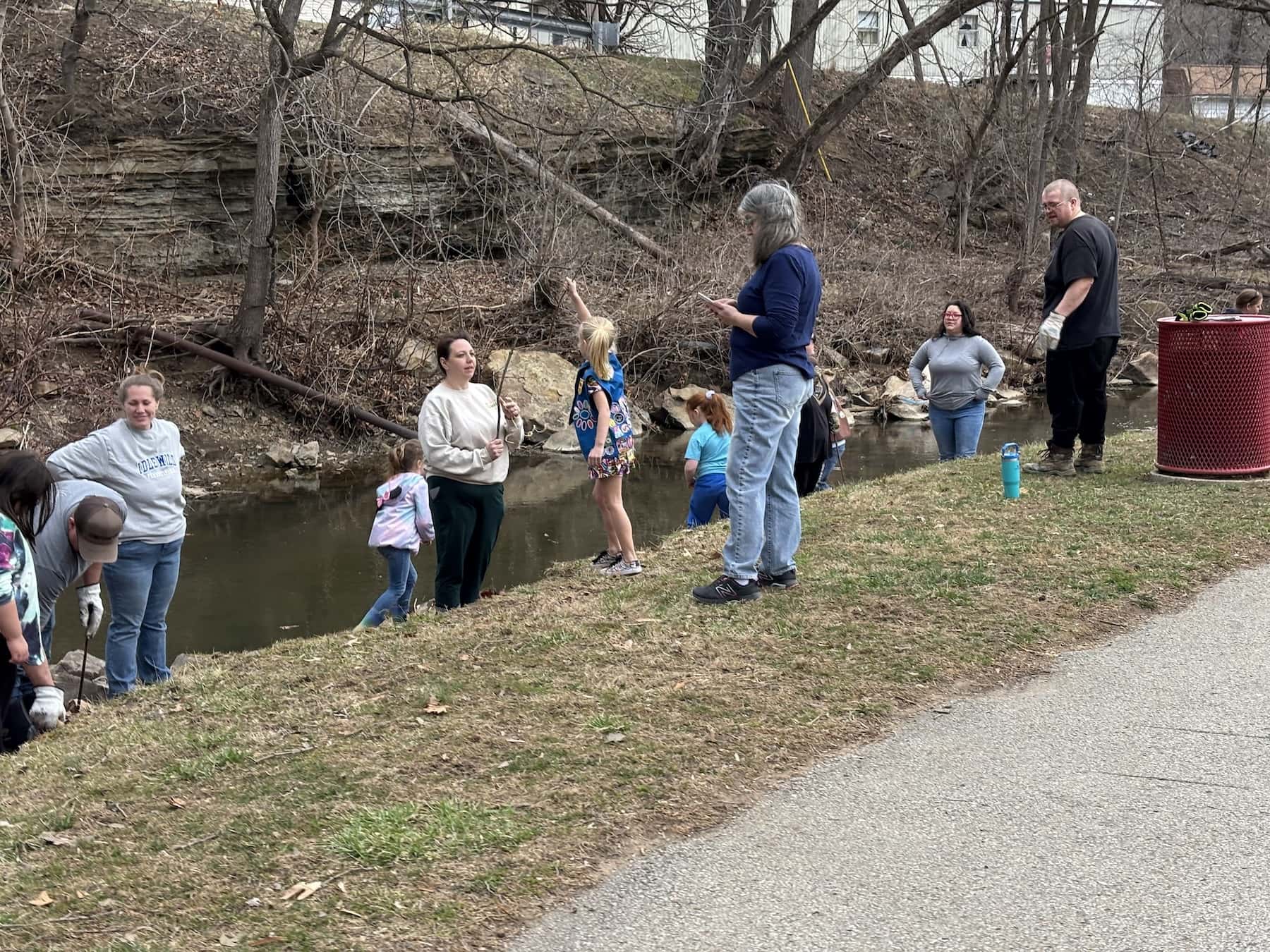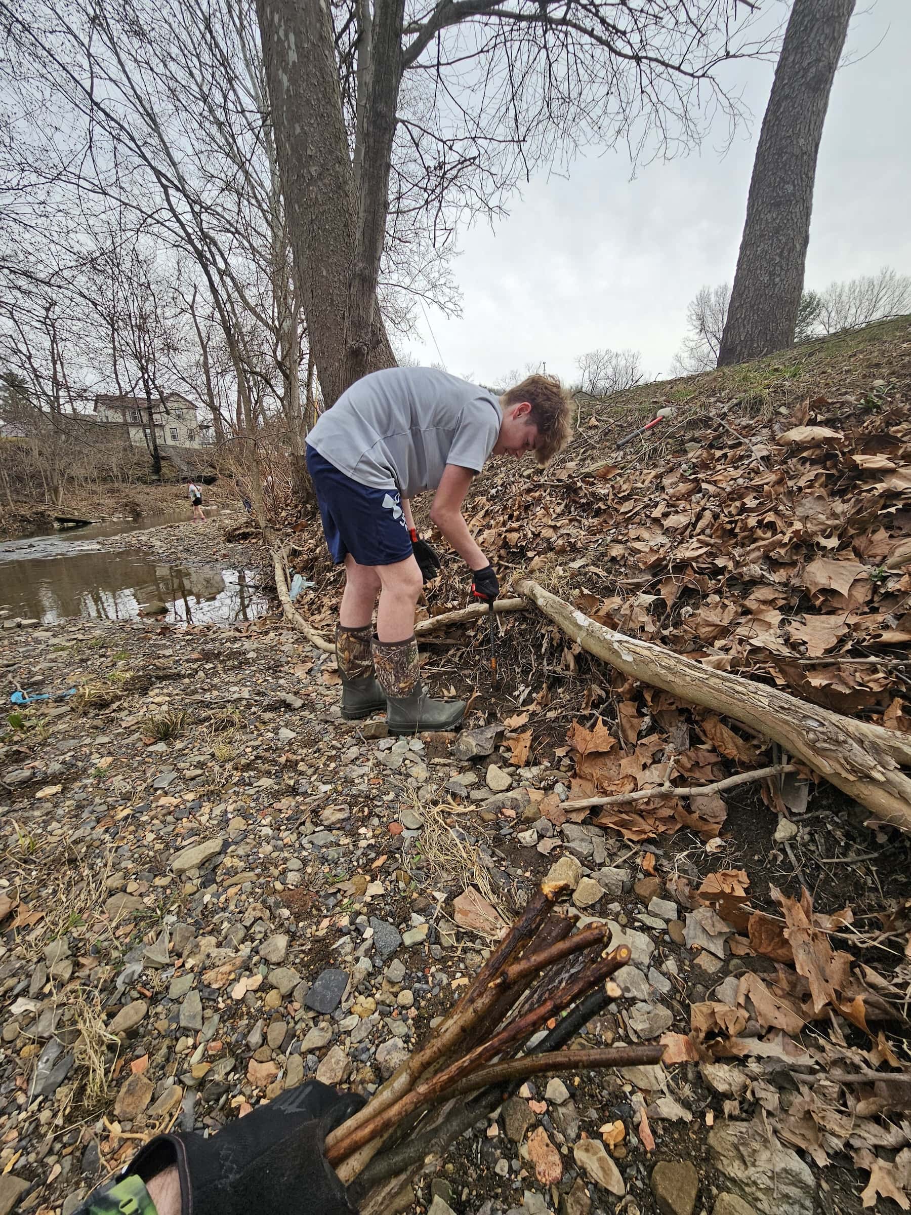 On March 15 over 2 dozen vols showed up by 10 AM. Many were scouts families with younger to older children. After a 10 minute sign in, planting procedure, & safety discussion we headed to the stream. We’d earlier scouted out the stream banks & picked 6 spots ranging from easy access to more difficult terrain. Planting groups could then pick location they felt most comfortable working. Groups set right to work (3 planting group pics) and were close to finished by 10:45 when everyone noticed the skies turning darker. Workers picked up the pace. By 11 AM all stakes were planted and groups were in the picture taking phase when the first raindrops fell. “OK folks” the call went out “standing in the water holding a steel bar is not where you want to be right now”. Everyone heeded & hustled for the exit and parking lot. By the time the skies opened up 15 min later all were either gone or safely in their vehicles.